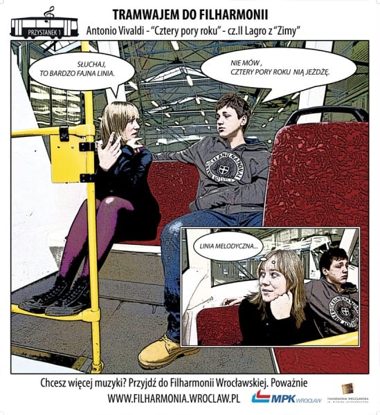 Już dziś, podczas pierwszego etapu akcji, we wrocławskich autobusach i tramwajach ujrzymy pięć odsłon komiksu, poświęconego odkrywaniu muzyki klasycznej przez dwójkę nastolatków. Chłopak i dziewczyna prowadząc rozmowę będą posługiwać się tytułami klasycznych utworów nieświadomi faktu że żonglują tytułami znanych utworów muzyki klasycznej